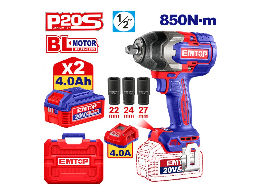 Aku rázový utahovák20V 850Nm 1/2" 2x4.0Ah