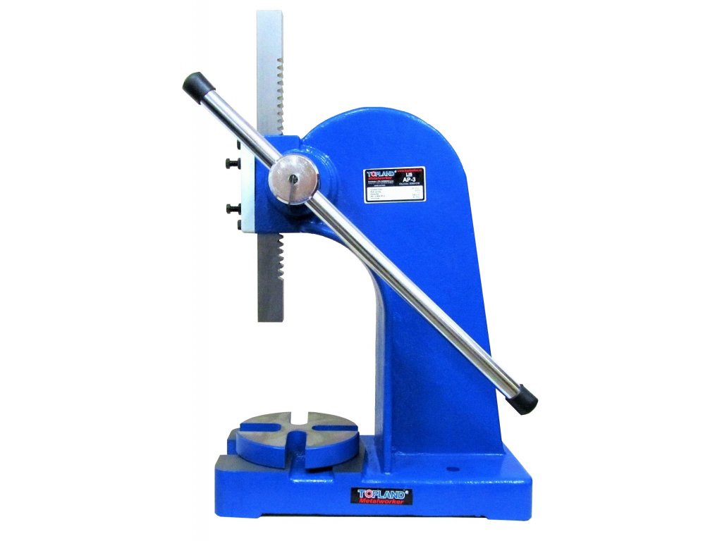 AP-3 ruční mechanický lis s otočnou pracovní deskou TOPLAND. V pracovní desce jsou čtyři volitelné šířky drážek. Používá se na lisování a rozlisování ložisek, pouzder a mnoha dalších dílců. Lis je stabilní konstrukce z kvalitní šedé litiny. Najde uplatnění ve strojírenství, zámečnictví i autoservisech.