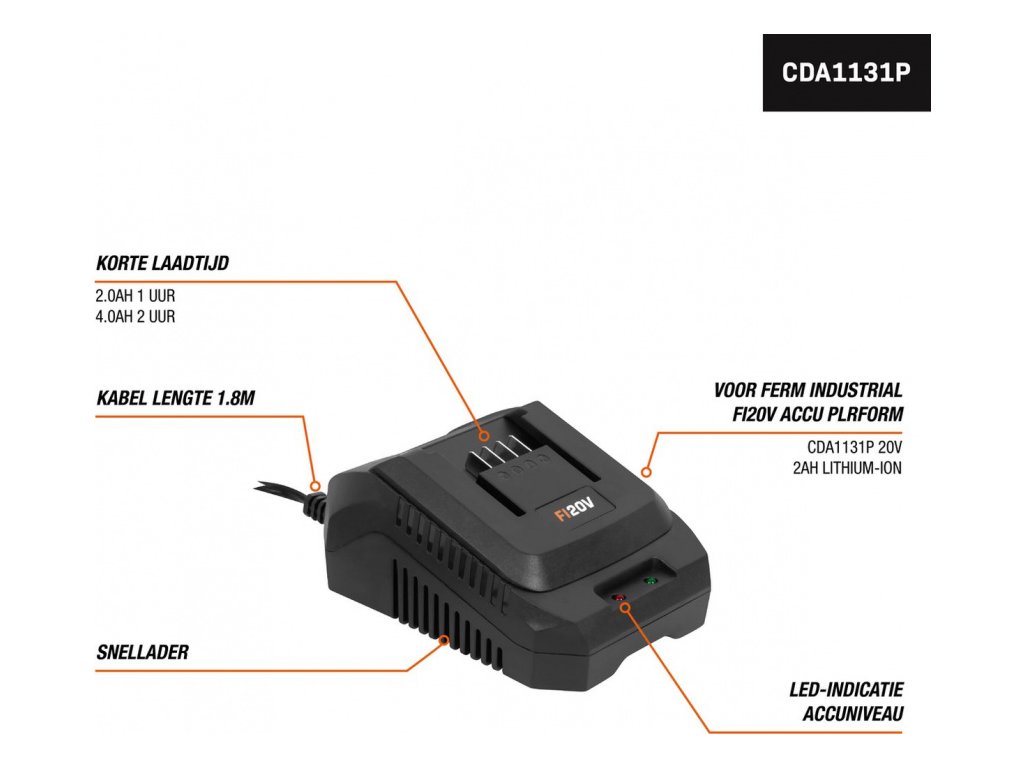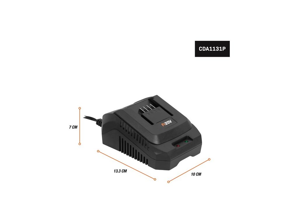 CDA1131P - Rychlonabíječka 20V e vybavena LED indikátorem provozního režimu, určeným pro nabíjení li-ion baterií pracujících v systému 20V. Elektronický systém pracující s nabitým akumulátorem zajišťuje maximální životnost akumulátorových článků.