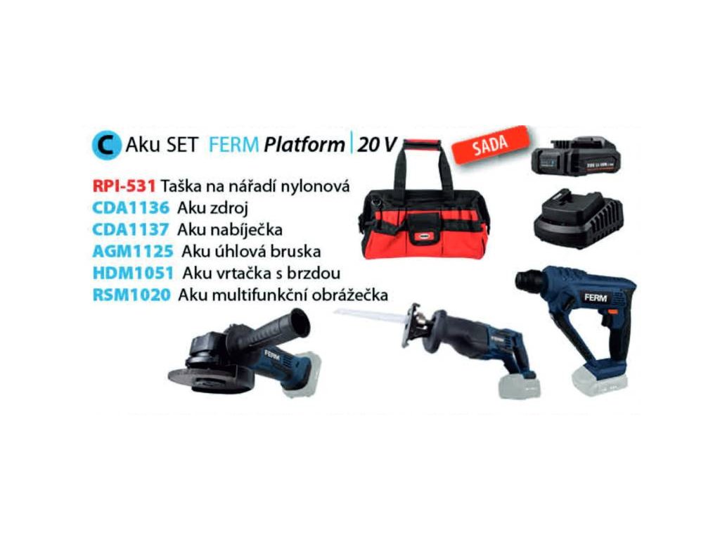 Ferm aku sada nářadí C, taška RPI-531, úhlová bruska AGM1125, bourací kladivo HDM1051, pila ocaska RSM1020, zdroj 2.0Ah CDA1136, nabíječka CDA1137