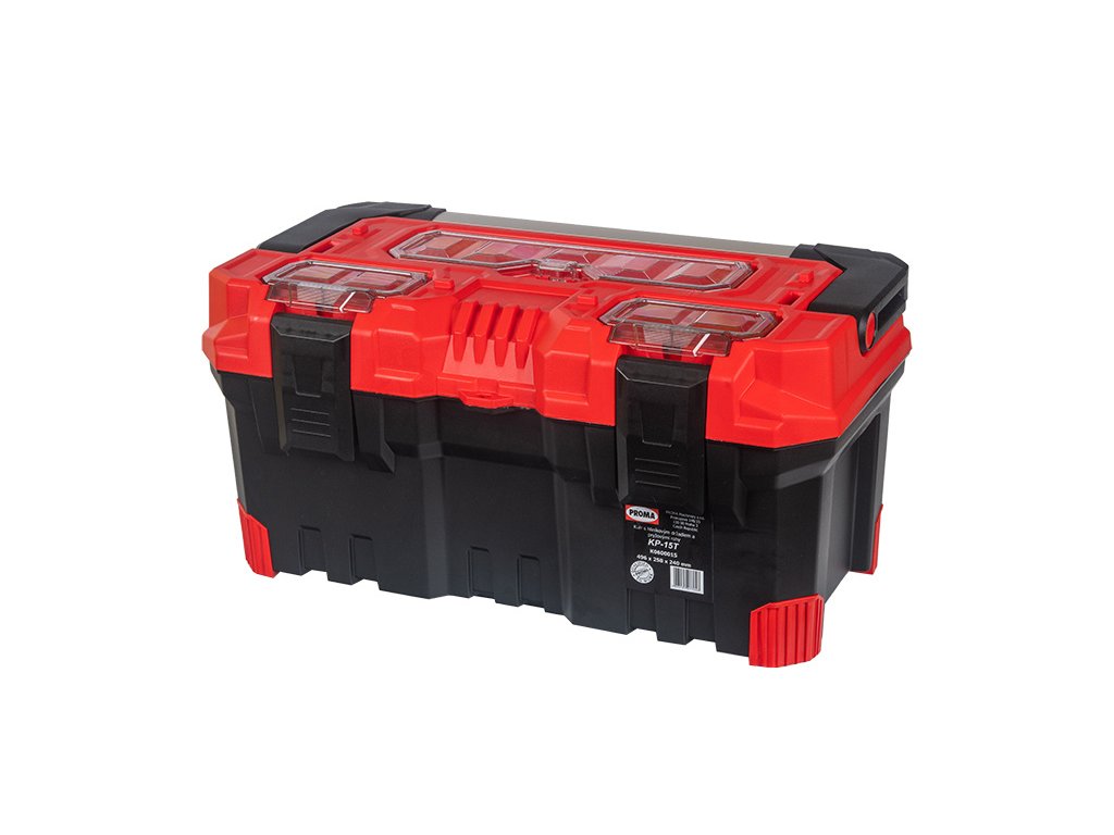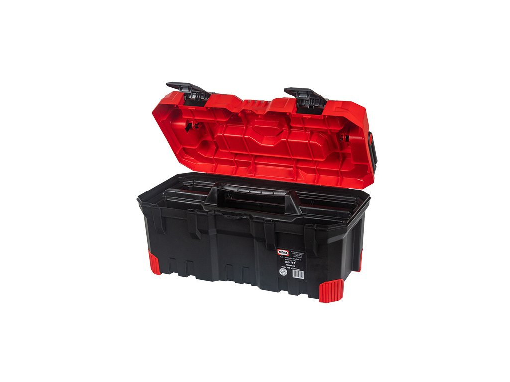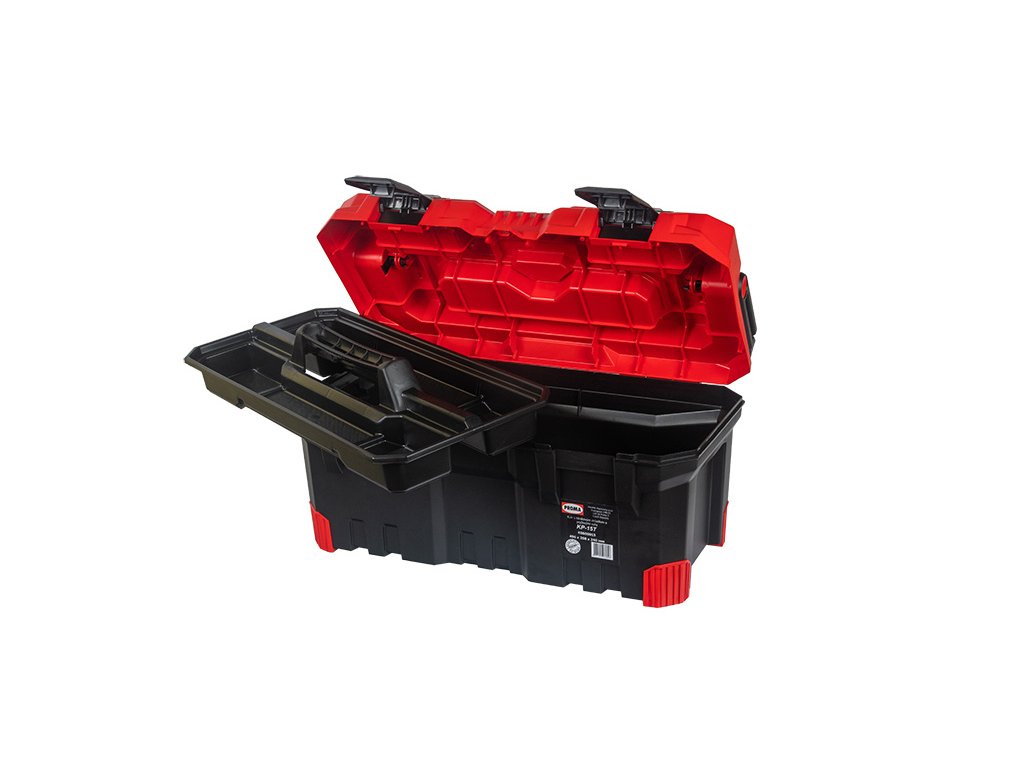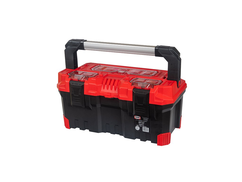 Plastový kufr na nářadí s hliníkovým držadlem a pryžovou ochranou rohů.