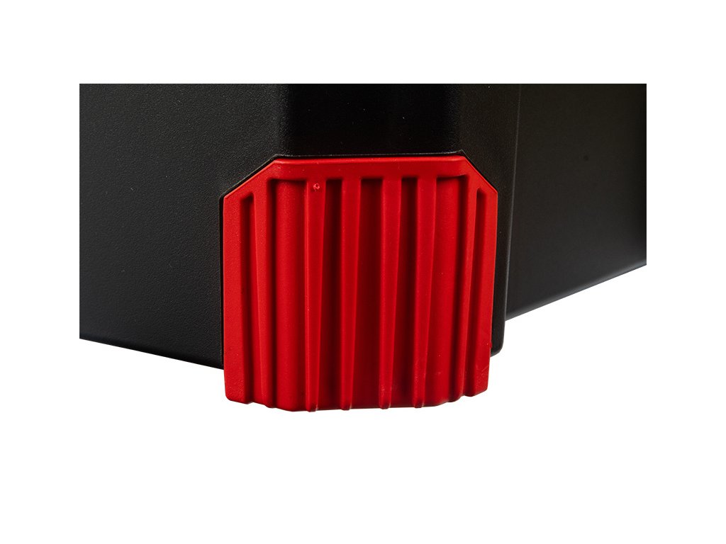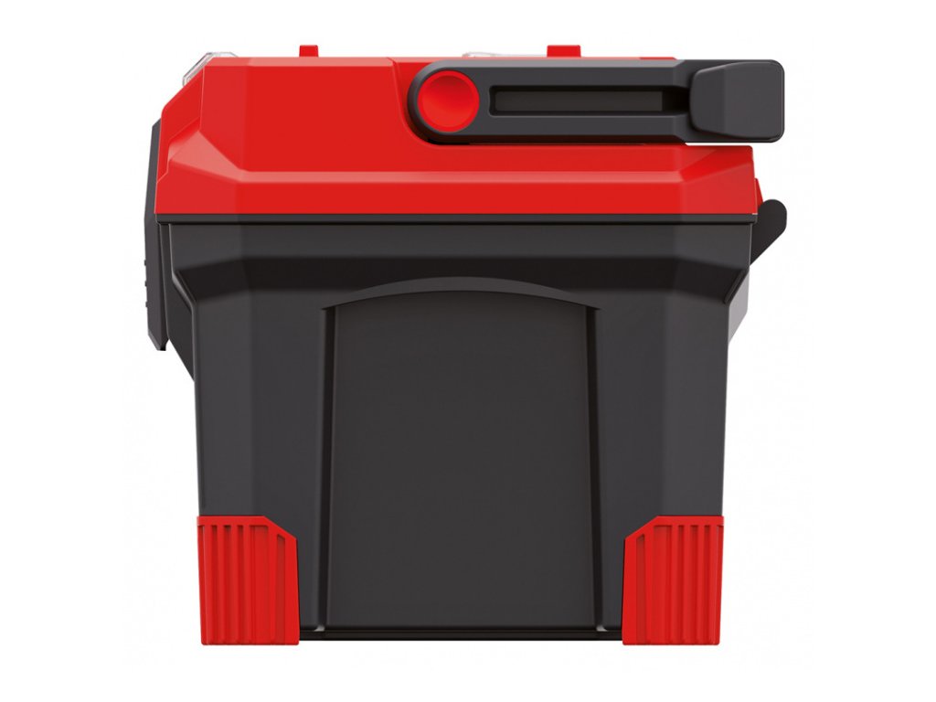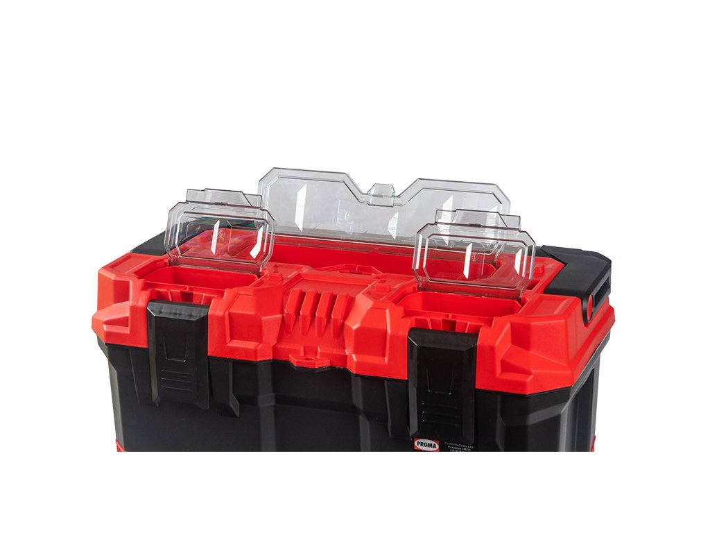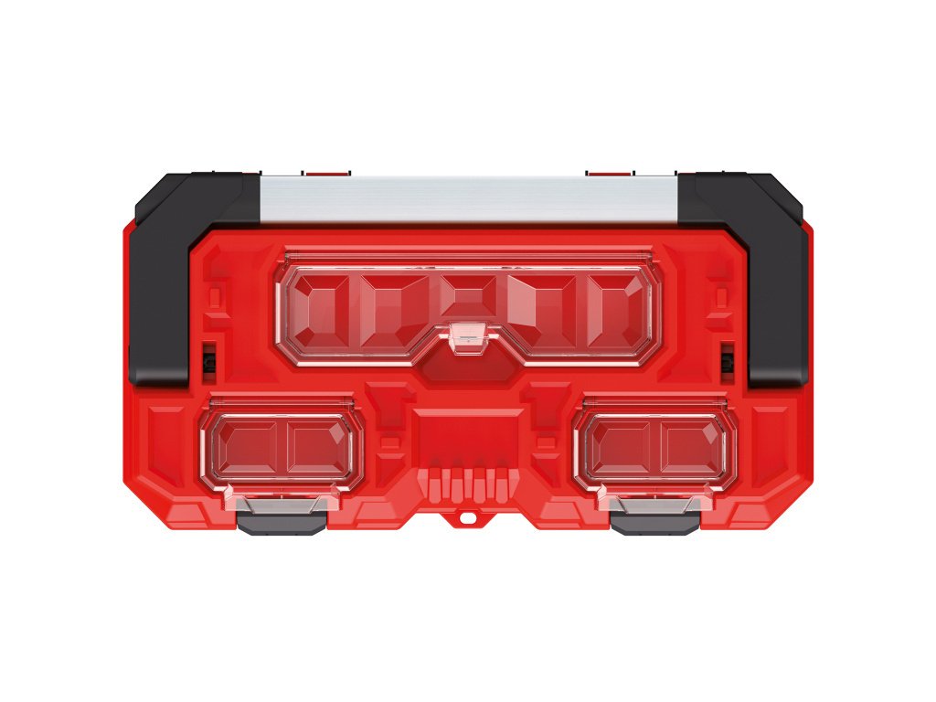 Plastový kufr na nářadí s hliníkovým držadlem a pryžovou ochranou rohů.