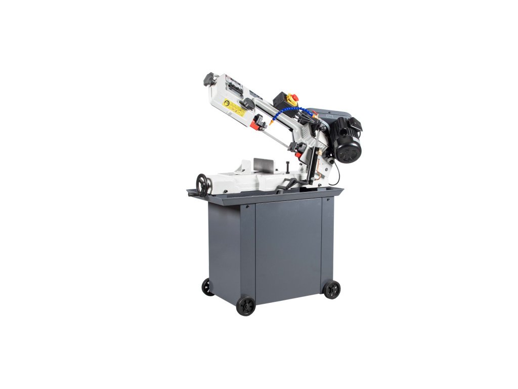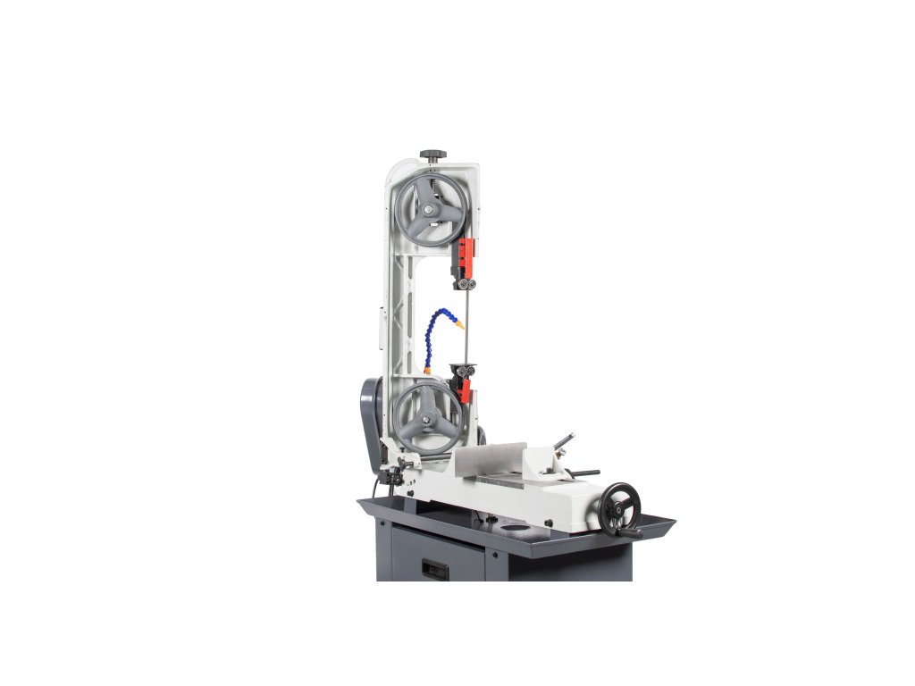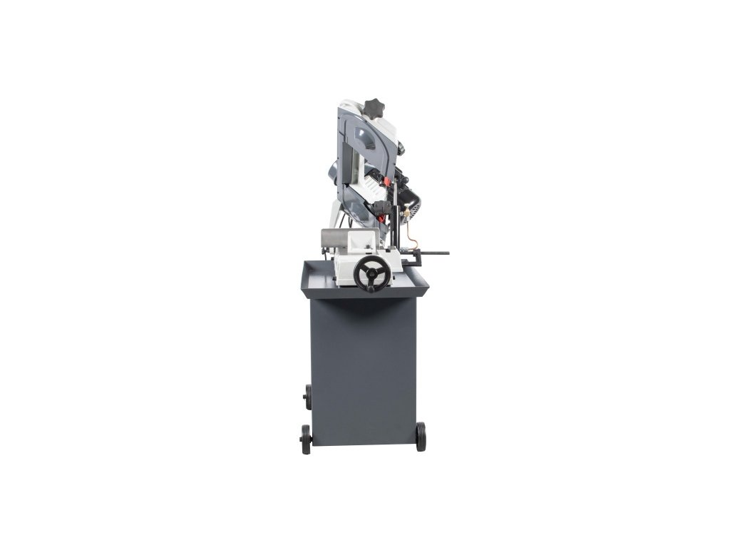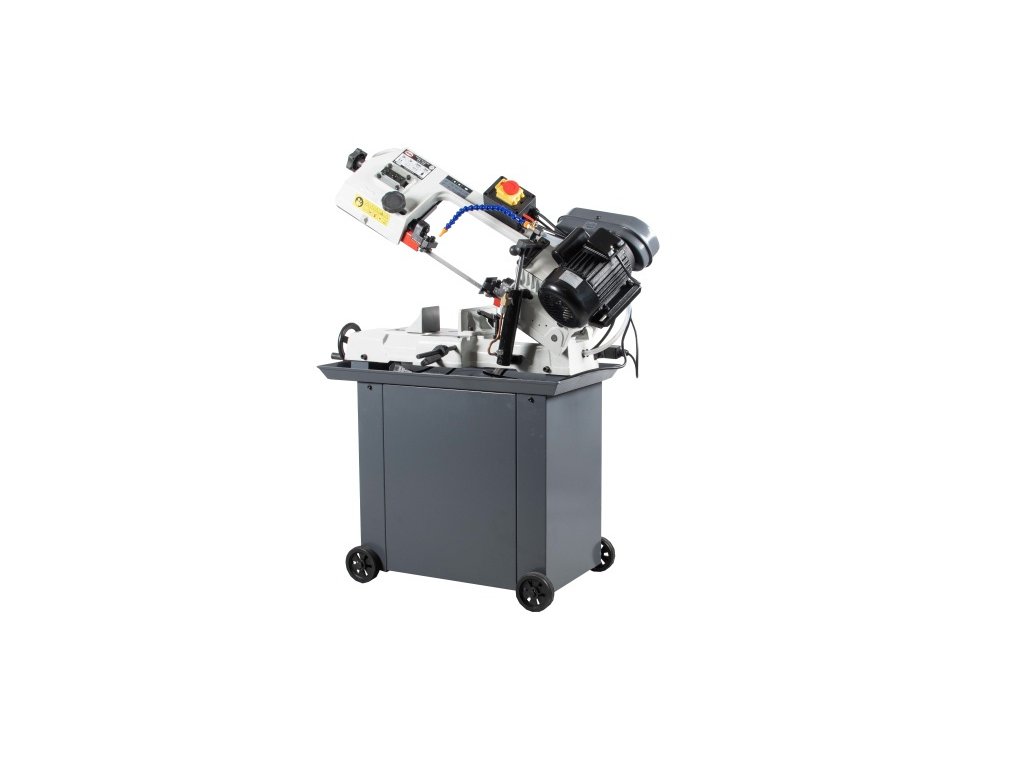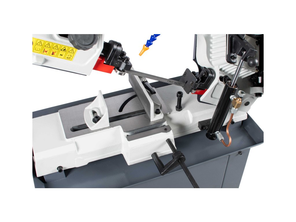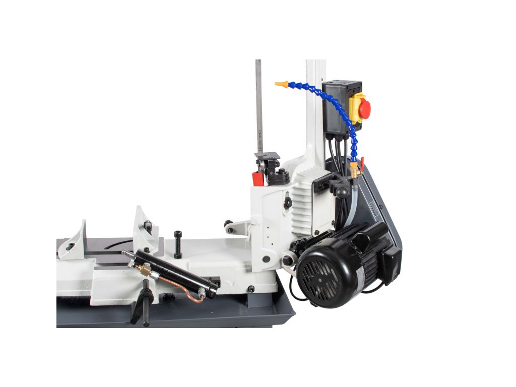 Cenově výhodná pásová pila na kov s optimálním řezným výkonem je díky snadné obsluze, hydraulickému a chladicímu zařízení vhodná i pro náročnější kutily, kteří nepotřebují oboustranné úhlování ramena. Rychlost plynulého klesání ramene pily lze korigovat za pomocí ventilu na hydraulickém válci, který lze i snadno odstranit. Řeznou rychlost pilového pásu lze manuálně nastavit na požadovanou polohu klínového řemene na řemenici, která pak následně přenáší pohyb přes šnekovou převodovku v olejové lázni na pásovici s pilovým pásem. Chladící systém je zabudovaný ve stabilním mobilním podstavci. Volba rychlosti padání ramene, k tomu optimální řezná rychlost a chlazení kapalinou v místě řezu, prodlužují životnost pilového pásu až na trojnásobek. Koncový vypínač zastavuje pilový pás po ukončení řezu u tohoto modelu automaticky. Řez pod úhlem 0-45° se provádí nastavením pevné čelisti svěráku dle stupnice umístěné na základně.