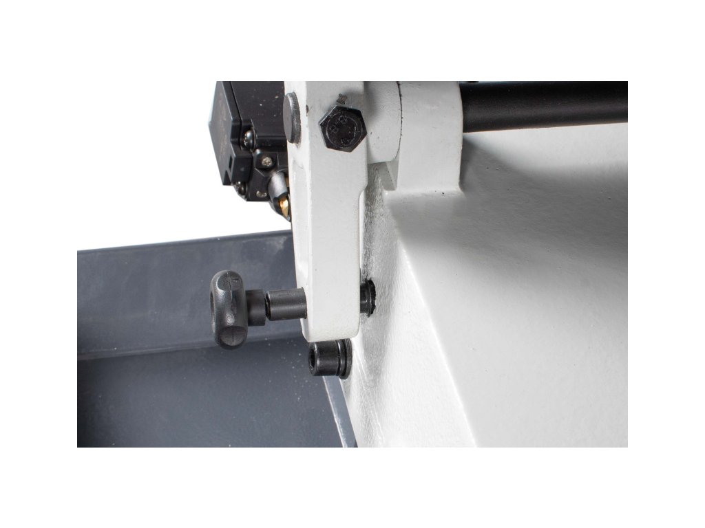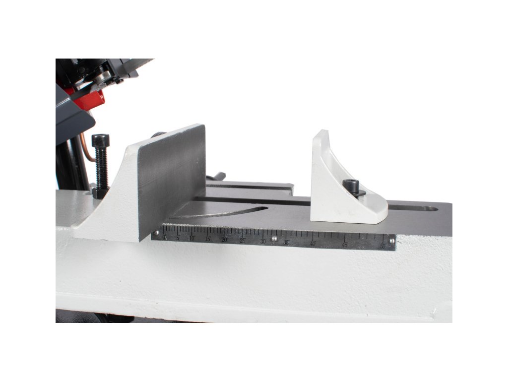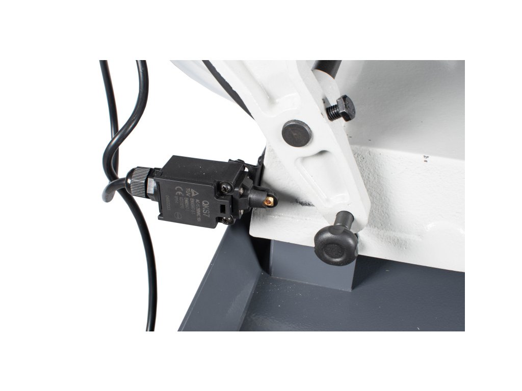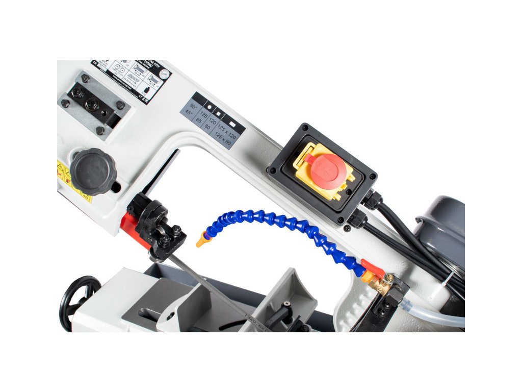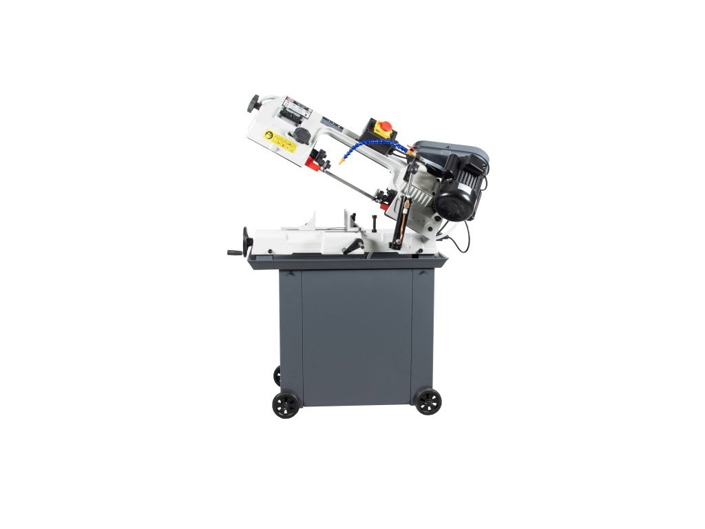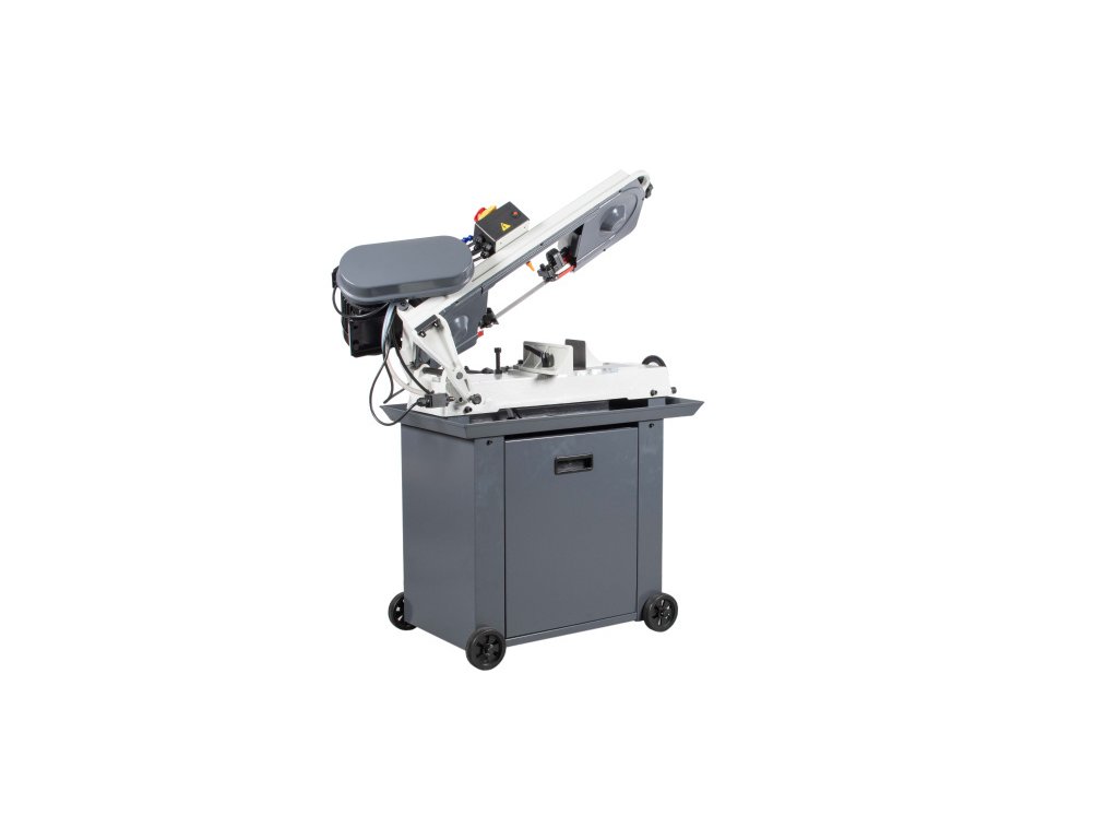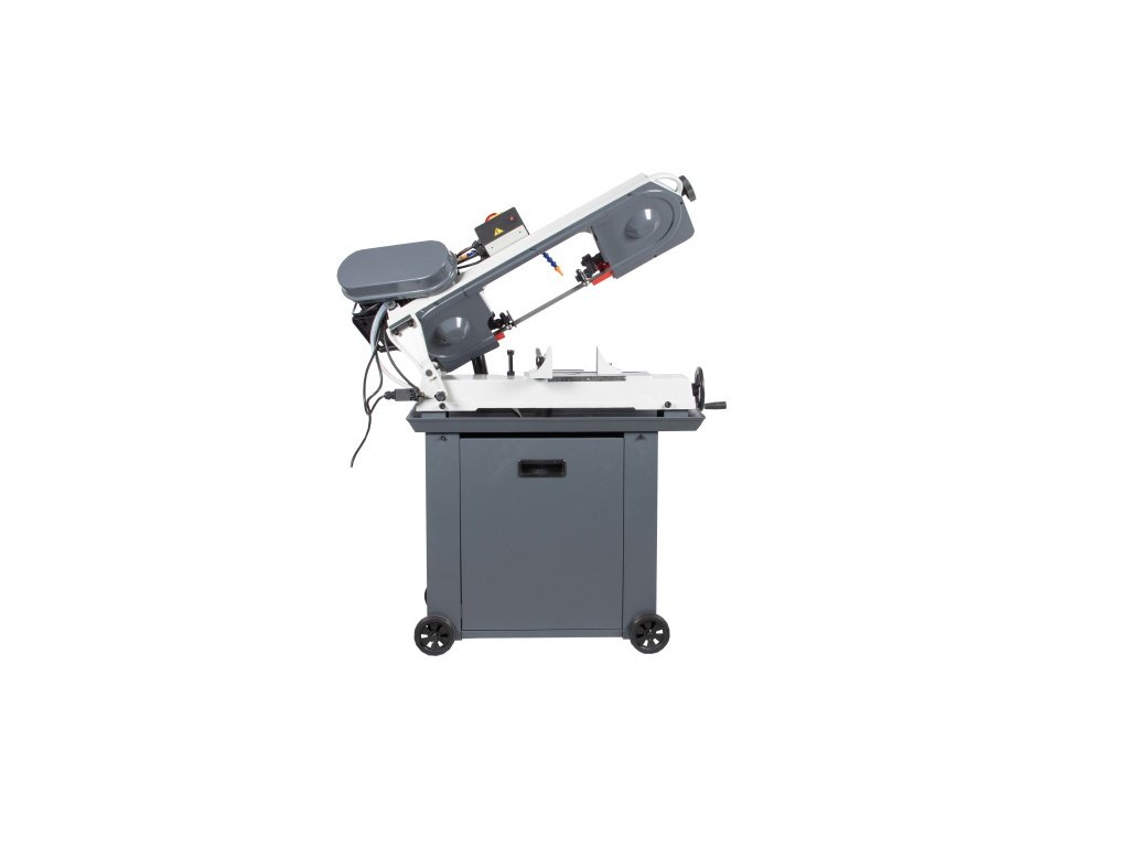Cenově výhodná pásová pila na kov s optimálním řezným výkonem je díky snadné obsluze, hydraulickému a chladicímu zařízení vhodná i pro náročnější kutily, kteří nepotřebují oboustranné úhlování ramena. Rychlost plynulého klesání ramene pily lze korigovat za pomocí ventilu na hydraulickém válci, který lze i snadno odstranit. Řeznou rychlost pilového pásu lze manuálně nastavit na požadovanou polohu klínového řemene na řemenici, která pak následně přenáší pohyb přes šnekovou převodovku v olejové lázni na pásovici s pilovým pásem. Chladící systém je zabudovaný ve stabilním mobilním podstavci. Volba rychlosti padání ramene, k tomu optimální řezná rychlost a chlazení kapalinou v místě řezu, prodlužují životnost pilového pásu až na trojnásobek. Koncový vypínač zastavuje pilový pás po ukončení řezu u tohoto modelu automaticky. Řez pod úhlem 0-45° se provádí nastavením pevné čelisti svěráku dle stupnice umístěné na základně.