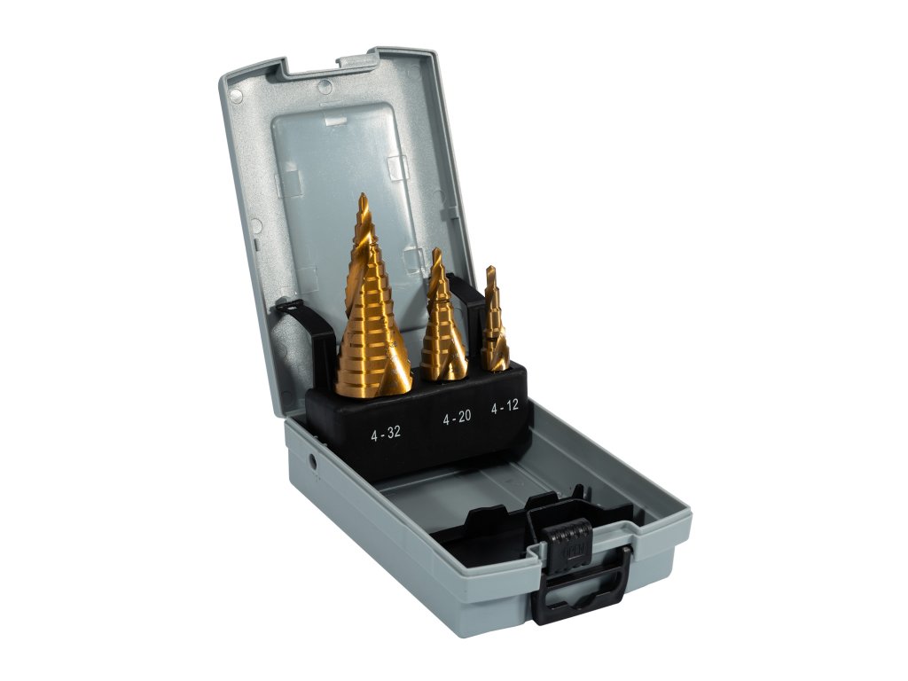 Sada stupňovitých vrtáků slouží pro vyvrtání kruhových otvorů v ocelových plátech (i měkčí materiály jako dřevo, plast...).Plynulé a bezhrotové vrtání bez deformace materiálu. Díky titanovému povrchu je vrták mnohem odolnější, použitelný téměř ve všech aplikacích. Výhodou TiN je dobrá elasticita a adheze, snižuje energetickou náročnost obrábění, chrání nástroj proti opotřebení na čele i hřbetu nástroje. Vhodné pro aku/elektrické vrtačky.
