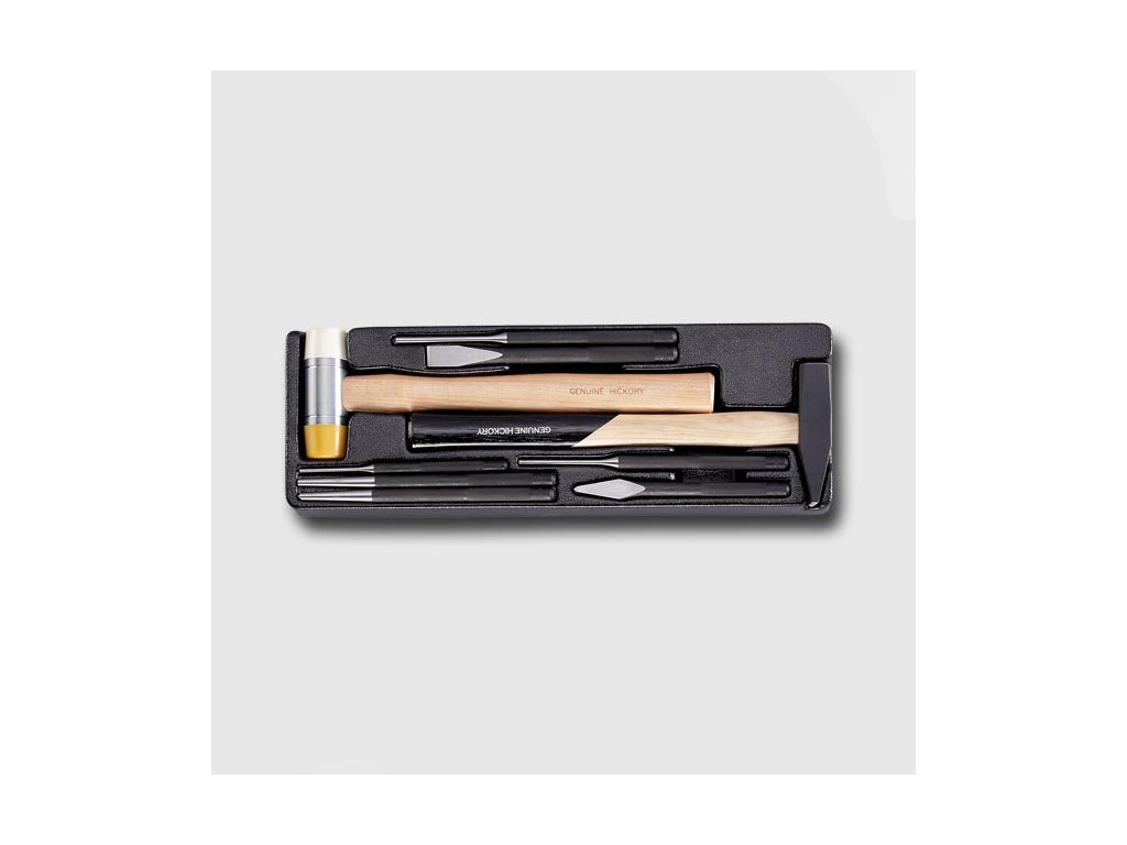 1x kladivo 300g; 1x palička 32mm; 1x plochý sekáč 15mm; 1x špičatý sekáč 5mm; 3x průbojník 3,4,5mm; 1x sekáč 6mm;1x důlčík 6mmDoplňkové parametry