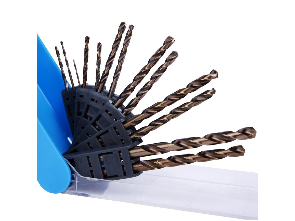 Sada 13 vrtáků XTLINE do kovu vyrobené z rychlořezné oceli HSS s příměsí 5% kobaltu, který zvyšuje tvrdost vrtáku a prodlužuje jeho životnost. Dělená špička broušená pod úhlem 135° vyžaduje menší tlak při vrtání a zabraňuje pohybu vrtáku po povrchu. Vhodné pro vrtání oceli, nerezové oceli, litiny a jiných kovů. Upnutí vrtáku na válcovou stopku a lze opětovně brousit. Sada vrtáků je uložena v plastové kazetě. Disponuje špičkou vrtáku SPLIT-POINT 135° pro dokonalé vystředění. Vybroušená šroubovice rychle odebírá vrtaný materiál.