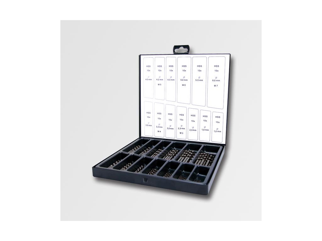Sada 130 vrtáků v kovovém kufru. vrtáky 1,0 - 6,0mm; 3,3-4,2mm