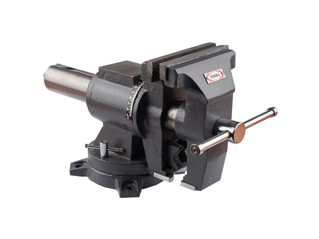 Víceúčelový stolní svěrák PROMA VS-150 je vynikajícím nástrojem pro pevné uchycení materiálů v různých úhlech a pozicích včetně druhých čelistí pro uchycení kulatého materiálu. S jeho robustní konstrukcí a širokou škálou možností nastavení je ideálním řešením pro profesionální dílny i domácí kutily.