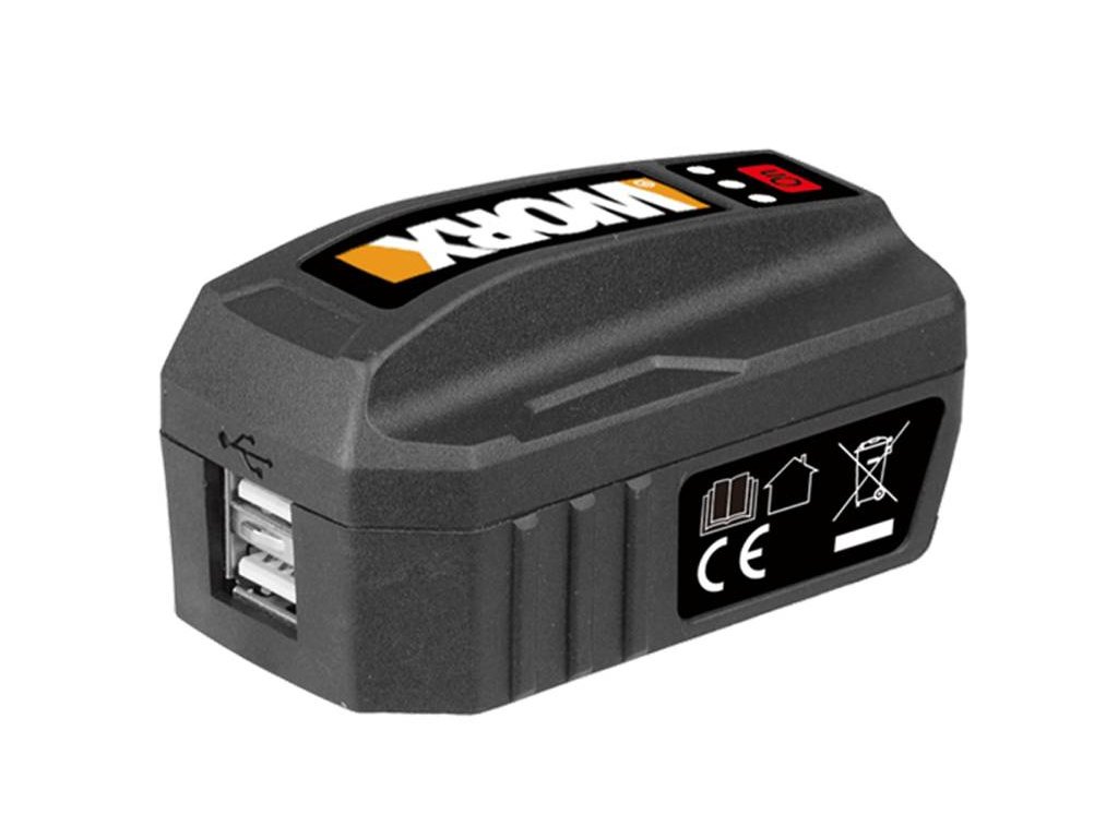 WA4009 - USB adaptér na baterii Mění jakoukoliv baterii WORX POWER SHARE na přenosný napájecí zdroj. Lze jej použít pro nabíjení mobilních telefonů, tabletů a malých elektronických zařízení. Disponuje háčkem pro zavěšení na řemen, 2 USB výstupy, indikátorem stavu nabití a 3dílnou konstrukcí pouzdra