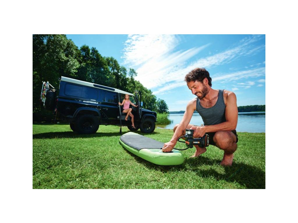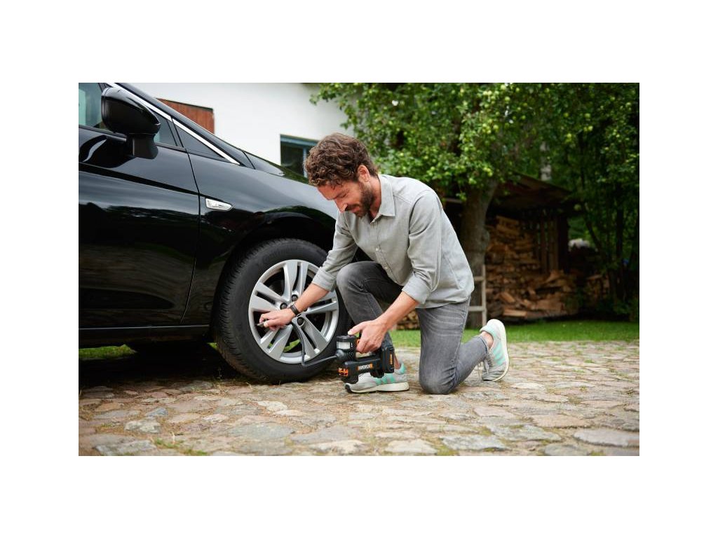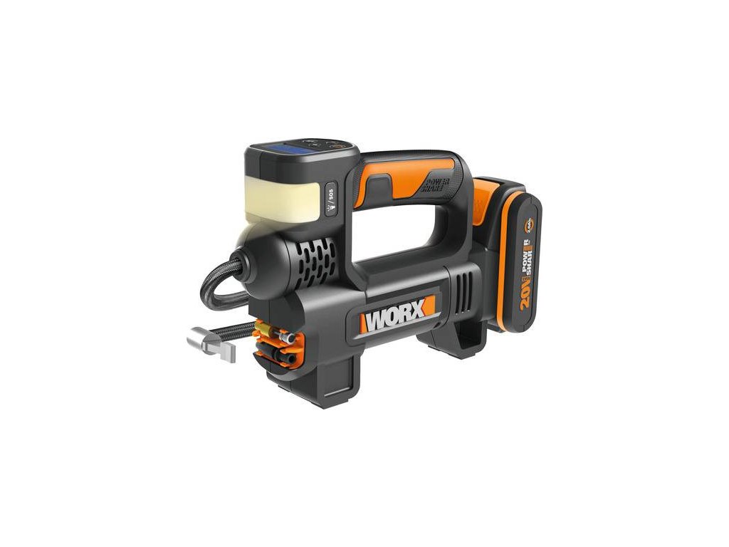 WX092 - Aku kompresor a lampa umožňuje pumpovat kola pod vysokým tlakem až 10 Bar. LED dioda funguje skvěle jako výstražné světlo vyzařující červeno-žluté SOS světlo nebo jako pracovní světlo. Zařízení má také monitor tlaku v pneumatikách a ochranu proti nadměrnému nafouknutí. Akumulátor PowerShare je kompatibilní se všemi bezdrátovými zařízeními WORX.